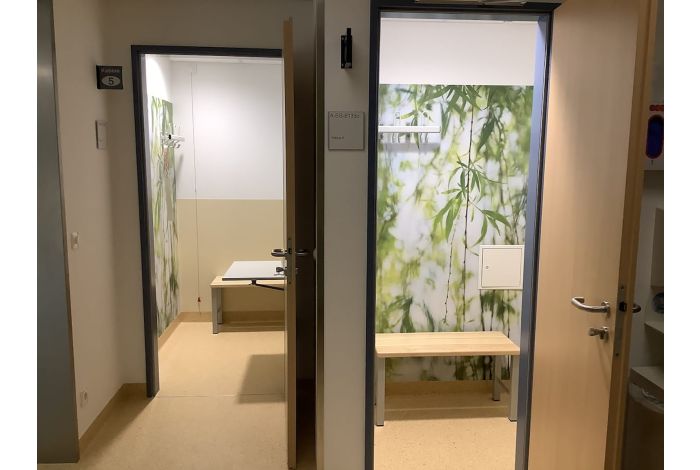 Wandverkleidung in der Radiologie im Flurbereich sowie der Umkleide mit Motiven, um eine Wohlfühlatmosphäre für Patienten und Personal zu schaffen.