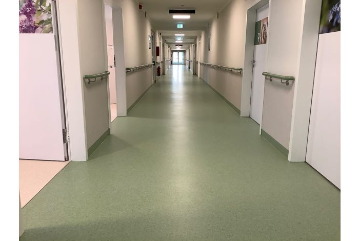 Wandverkleidung in den Patientenzimmern hinter den Betten und Waschbecken, sowie im Flur auf halber Höhe inkl. Handlauf farblich passend zum Bodenbelag (eine Farbe pro Ebene/Etage)